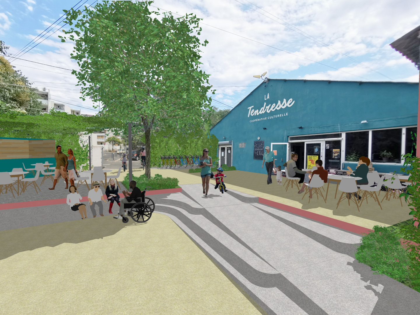 Favoriser une circulation à pied pour relier des habitant-es et des espaces e passant par un lieu qui se nomme la Tendresse, je trouve ça très fort... se donner rendez vous à la Tendresse, se retrouver devant la Tendresse, garer son vélo devant la Tendresse...