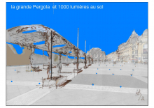 Je me disais aussi, que puisque planter des grands arbres serait compliqué avec le parking en dessous. Ce serait bien de mettre des structures en forme d'arbre (fabriqués en matériaux récupérés) ça ferait un peu d'ombres et donnerait du charme à la place de la comédie