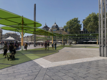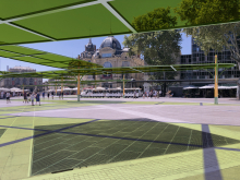 Vu la configuration, s'obstiner à planter des arbres relève du gadget couteux. Donc plutôt mettre des cheminements avec des ombrières et des vaporisateurs pour rafraîchir, et des zones où s'asseoir.
